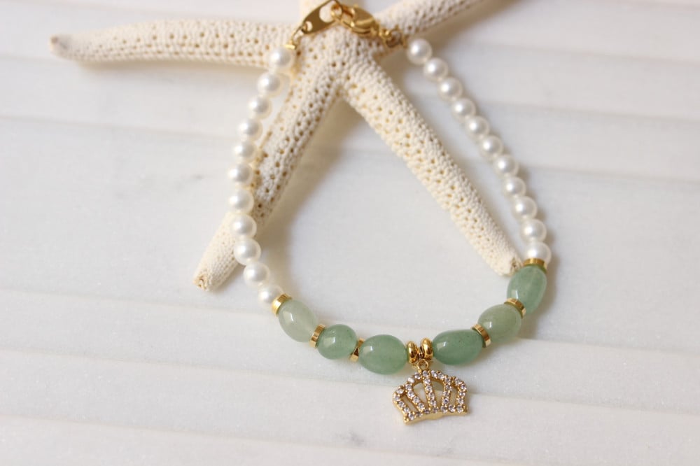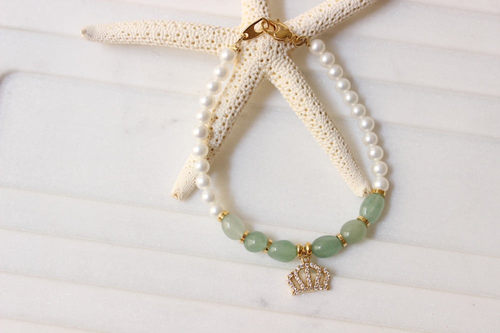 اسوره لولو صناعي مع حجر اخضر وتعليقة زركون تاج